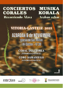 Azaroaren 9an, 12:30ean, Aliko San Millan elizan izango gara, Dulcinea koralarekin batera, «Musika Korala Araban zehar 2025» Arabako Koru Federazioak antolatutako kontzertu-zikloaren barruan.
